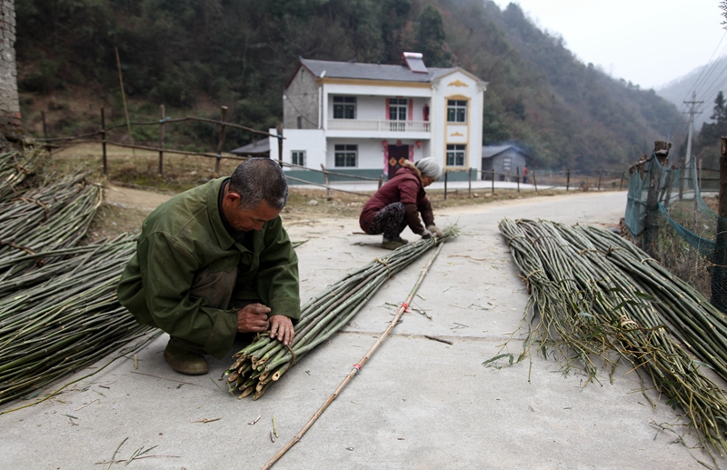 1月9日,深河乡麻线村村民刘正华夫妇把当天从山上采收的山竹扎成捆运送给经销商出售。据他介绍,每年在10月份至次年正月份这四个多月里,许多在家村民就到就山上砍竹子增加收入,按经销商的需求按竹竿的长度和根数扎成捆后,销售给他们,每捆能卖到10元至15元不等,一个劳力每天能砍10捆左右,收入在120元左右。仅此一项,每个劳动力一年可创收1.2万元以上,能带动全县2000余户贫困家庭脱贫。