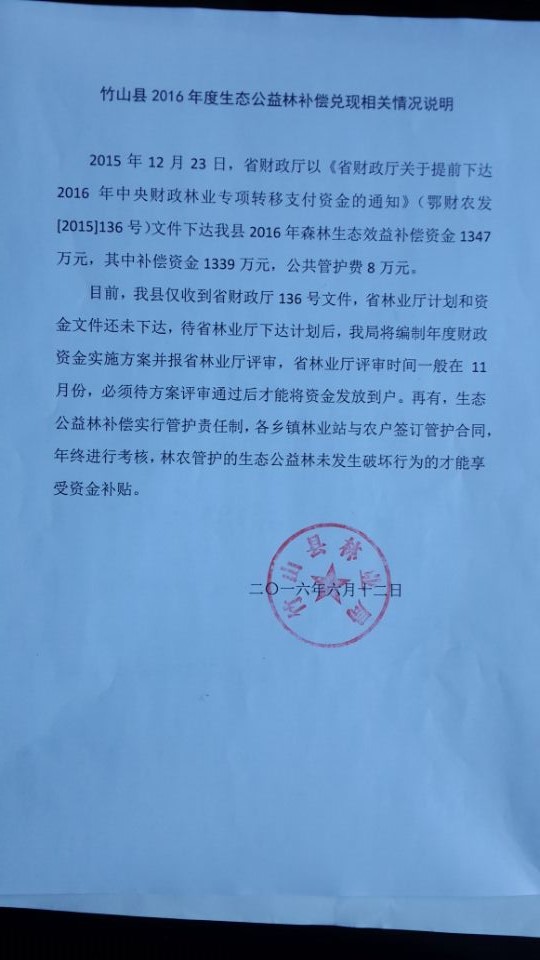 竹山县2016年度生态公益林补偿兑现相关情况说明